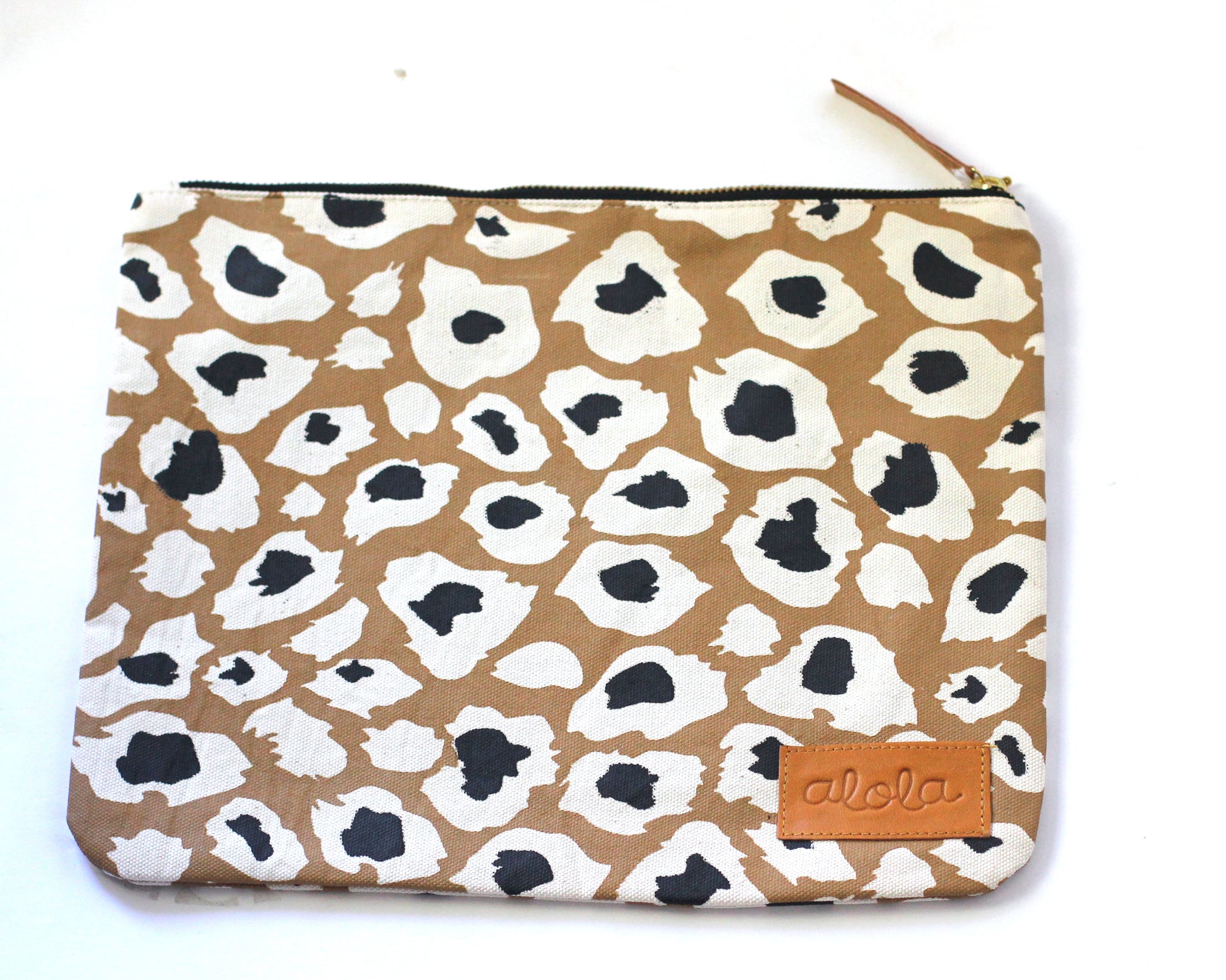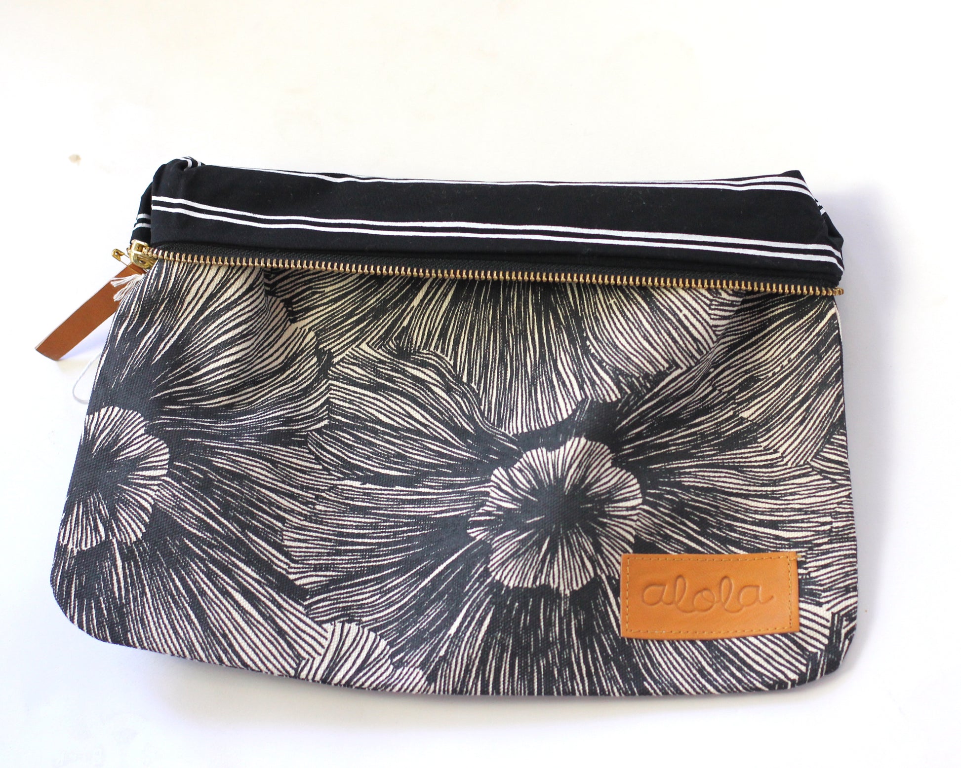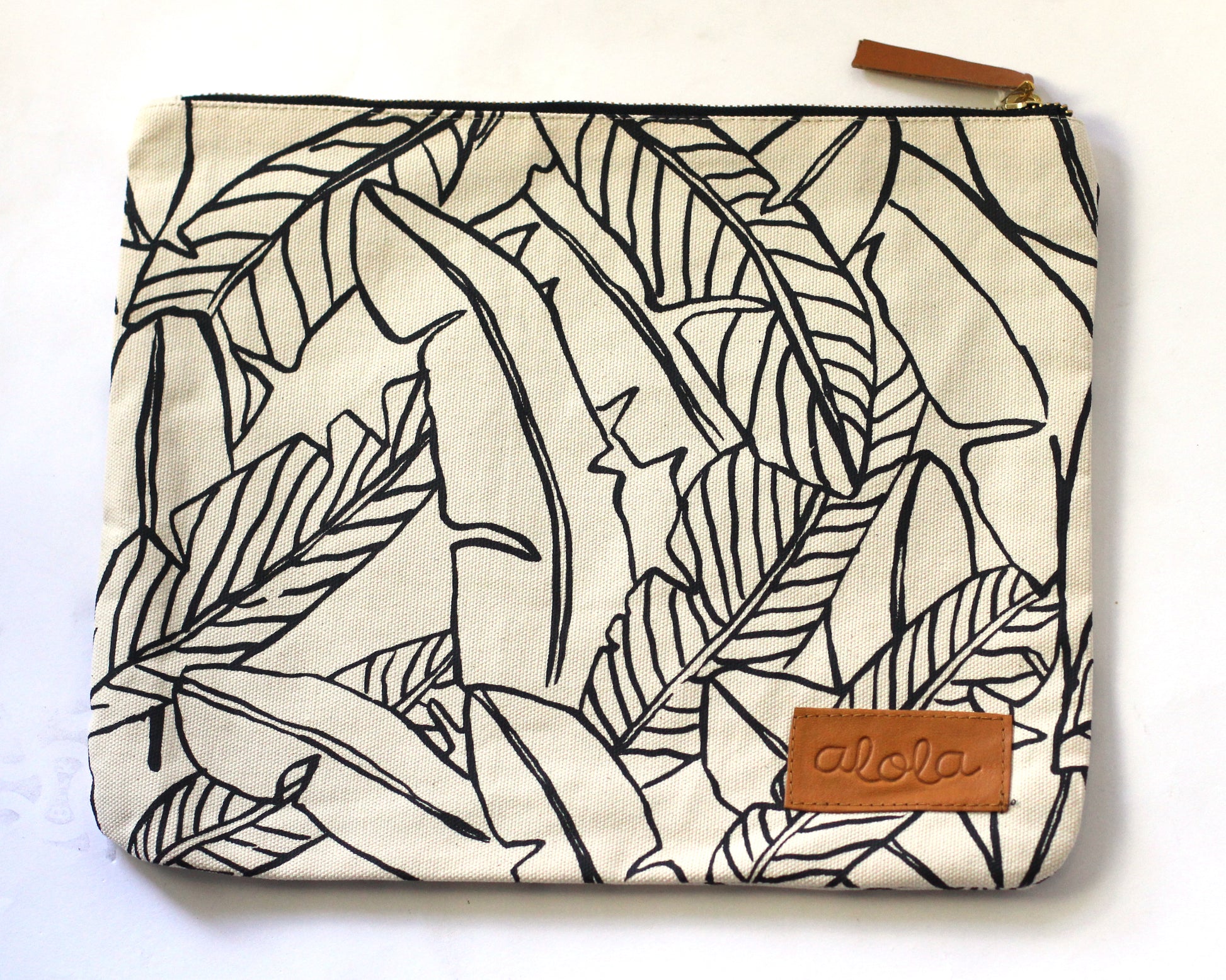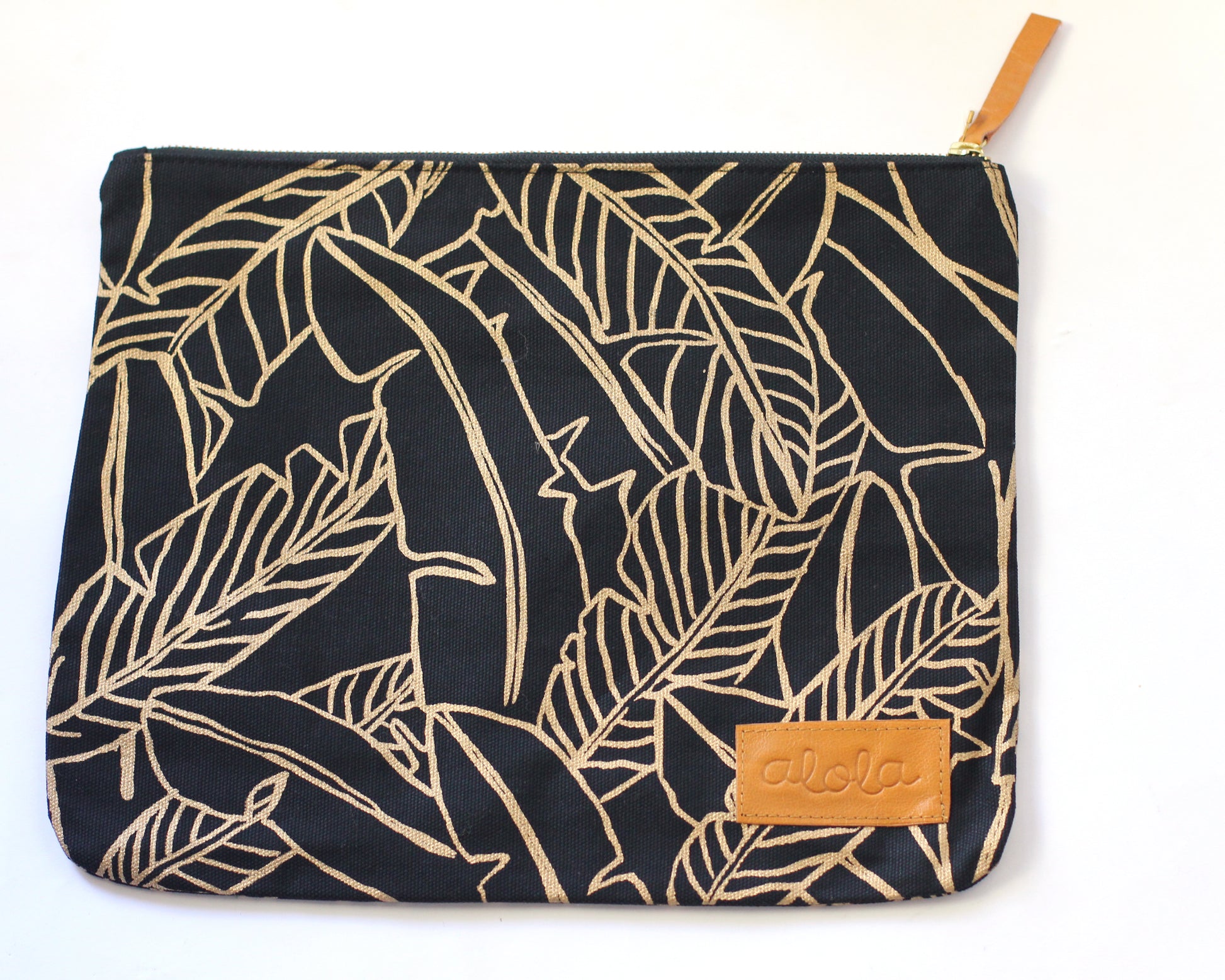 The original Alola Maui canvas clutch is refreshed in original prints! Gold zipper, interior pocket, and leather pull tabs make this Hale Zen exclusive your go-to carry-all.