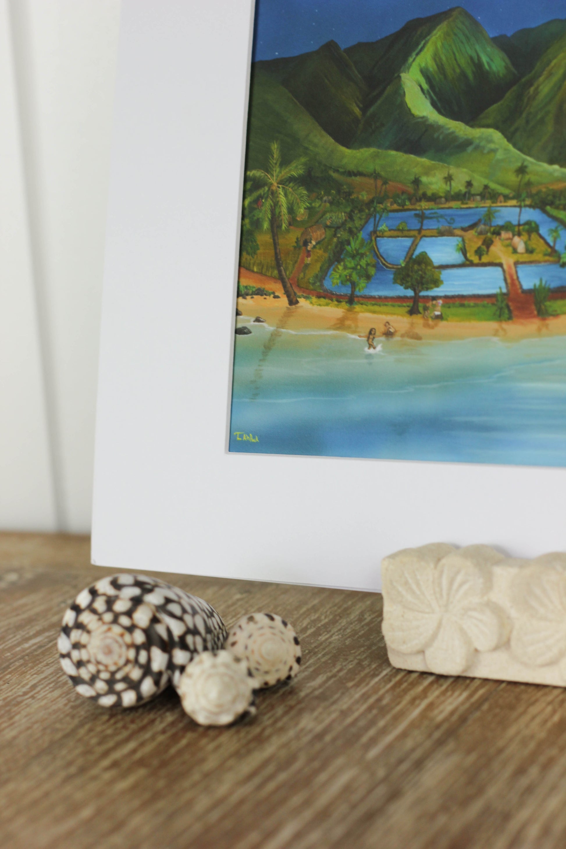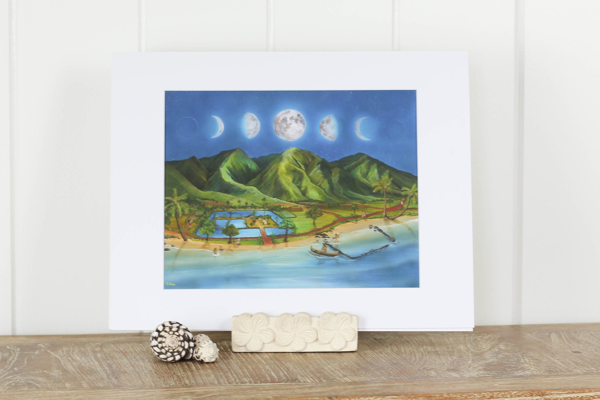 Kealaokamahina: ; Below Mauna Kahalawai, the people of ancient Lahaina perform tasks appropriate to the phase of the moon they were under