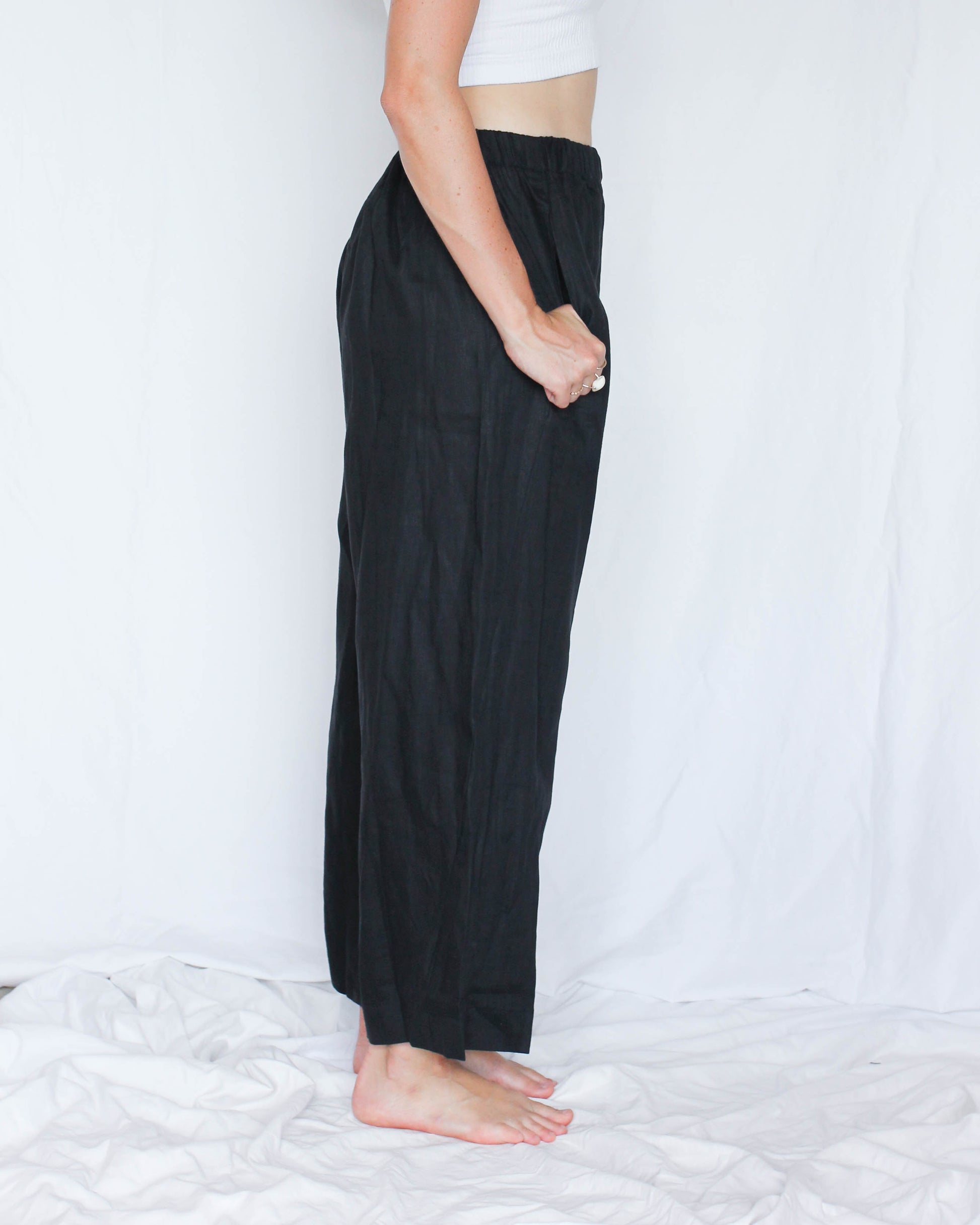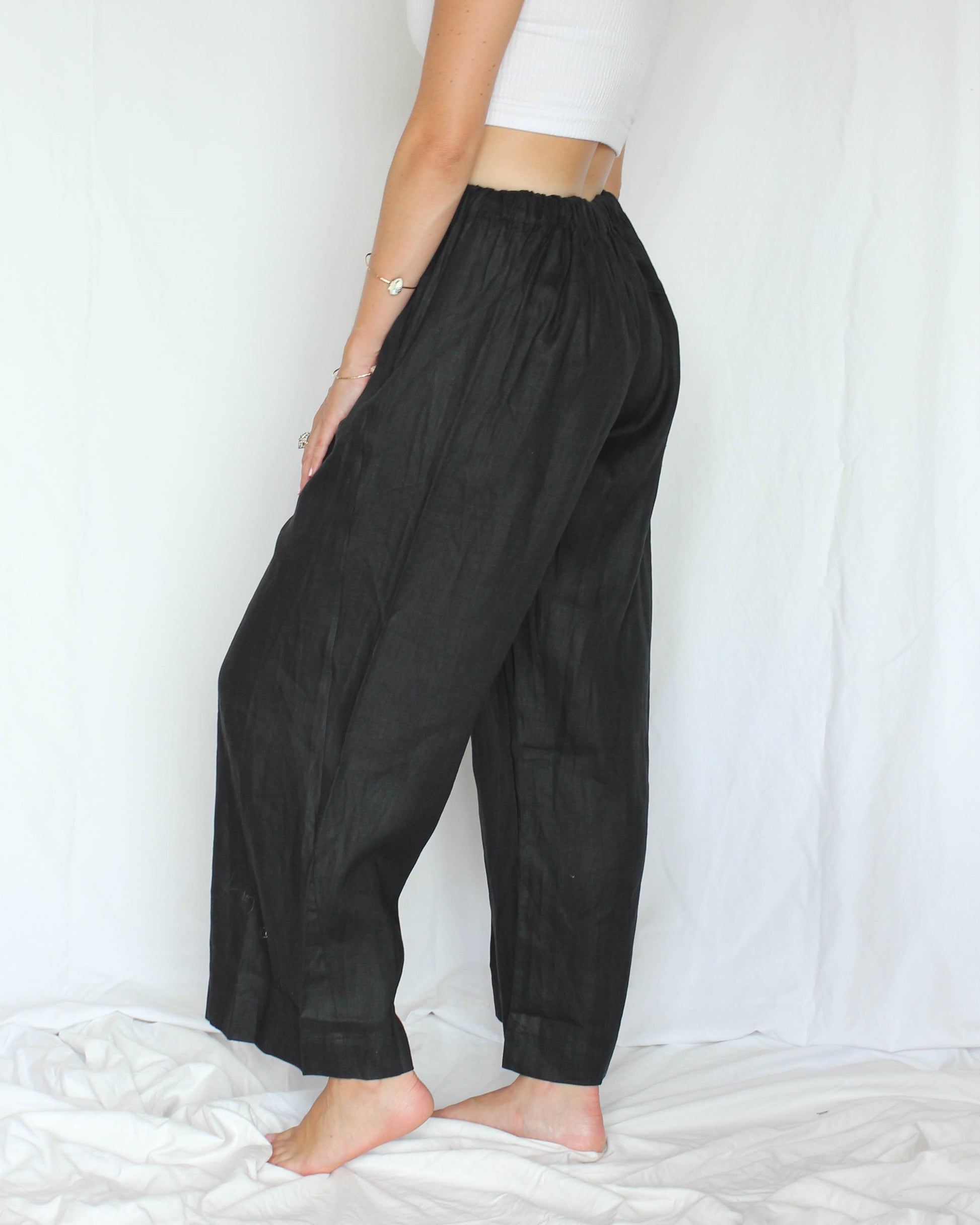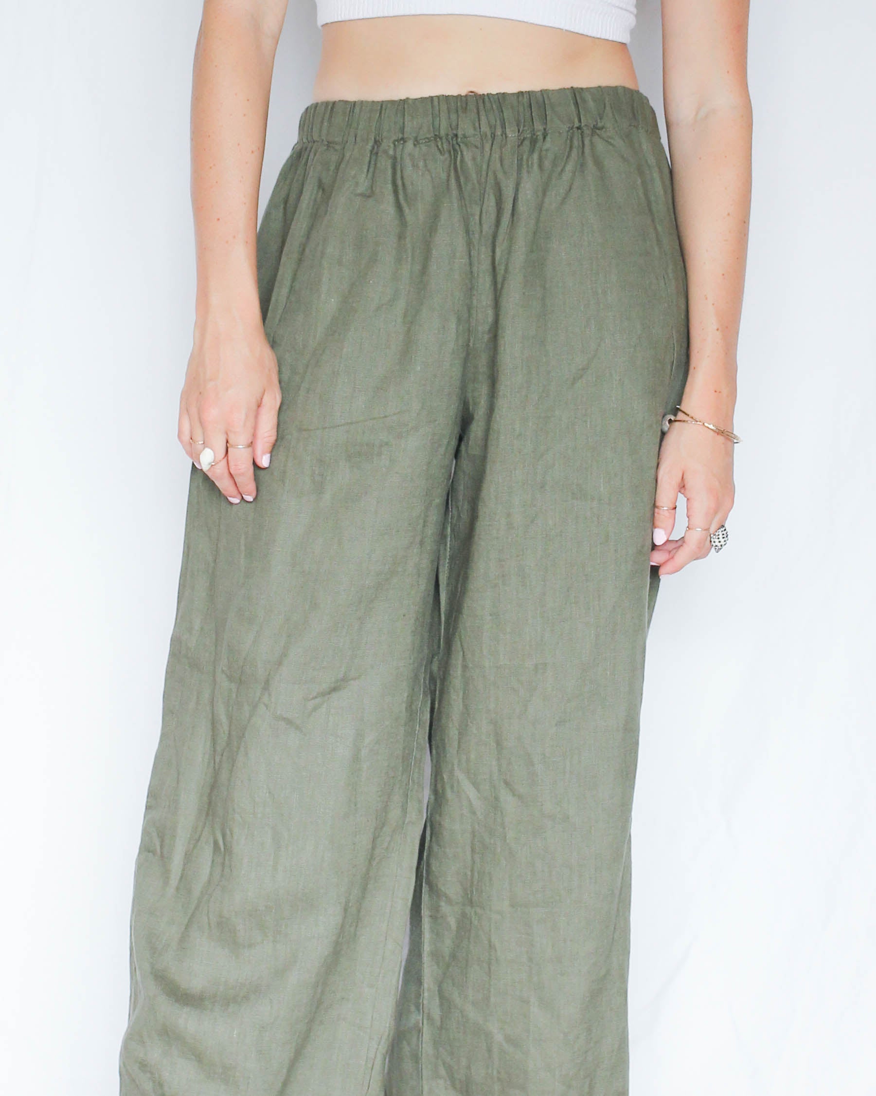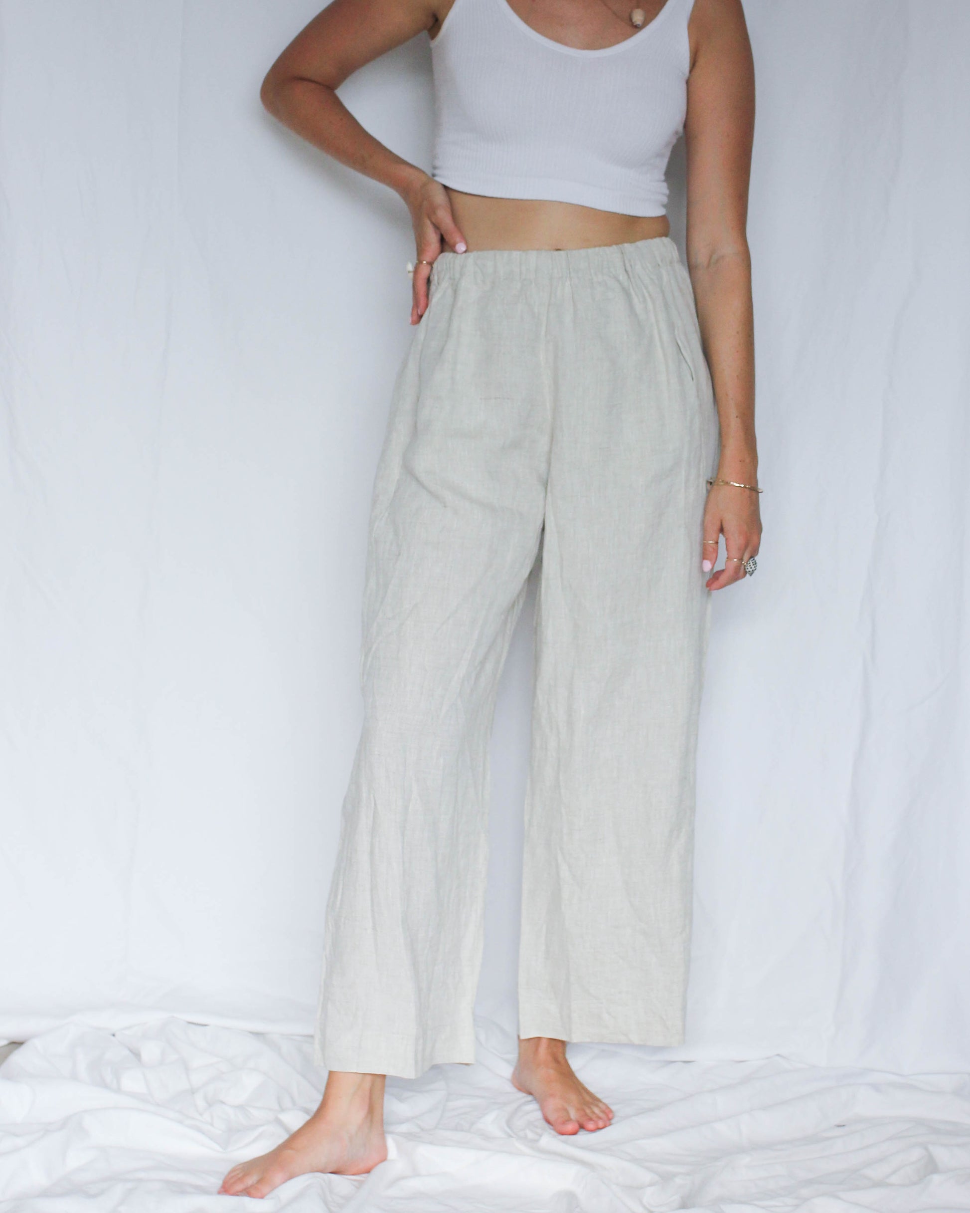 Cropped linen pants with an elastic waist offer both comfort and style. The soft, breathable linen fabric ensures a lightweight and airy feel, perfect for warm weather. The flattering silhouette that gently skims the hips and thighs before tapering slightly towards the hem, creating a chic and streamlined look. These pants are ideal for both casual and semi-formal occasions, providing a stylish yet relaxed vibe.