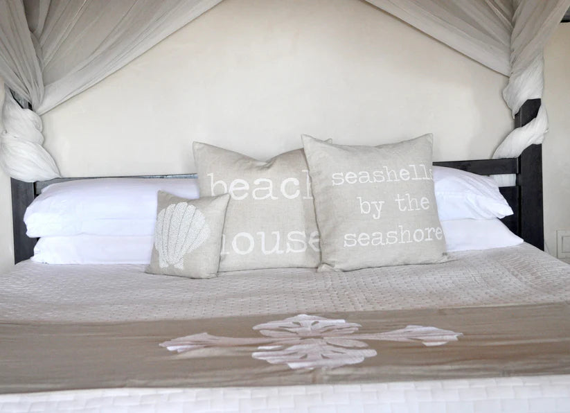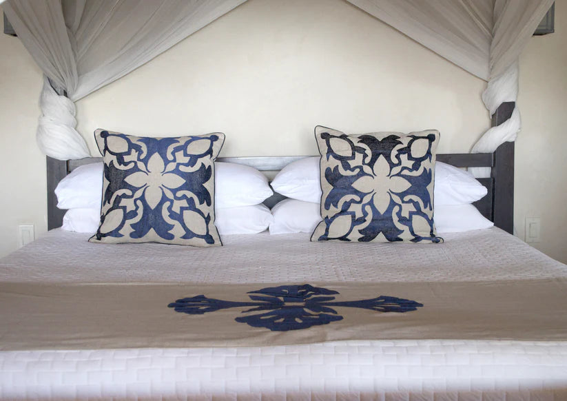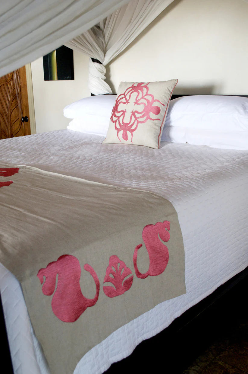 A beautiful bed runner made of natural colored linen with unique Hawaiian inspired design. The design is embroidered onto the runner in either white, coral, aqua, or navy thread colors. The bed runner is sized to be able to fit either a queen or king bed. The pictures of the bed runner are on a king sized bed. This runner is great to mix and match with all of our pillow styles.