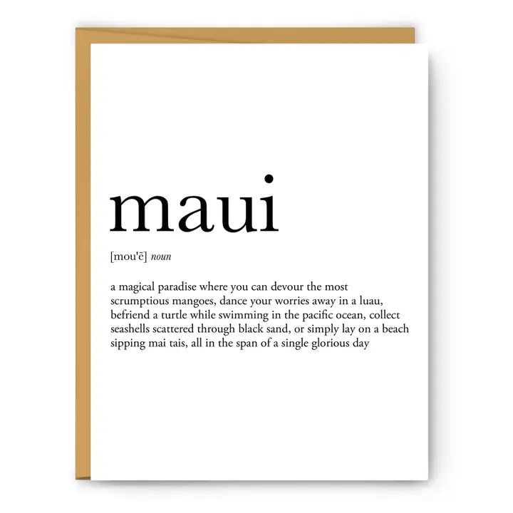 Experience the beauty and wonder of Maui with our Maui Definition Card. The blank interior allows for personalized messages while the warm brown envelope adds a touch of elegance. Perfect for an all occasion card